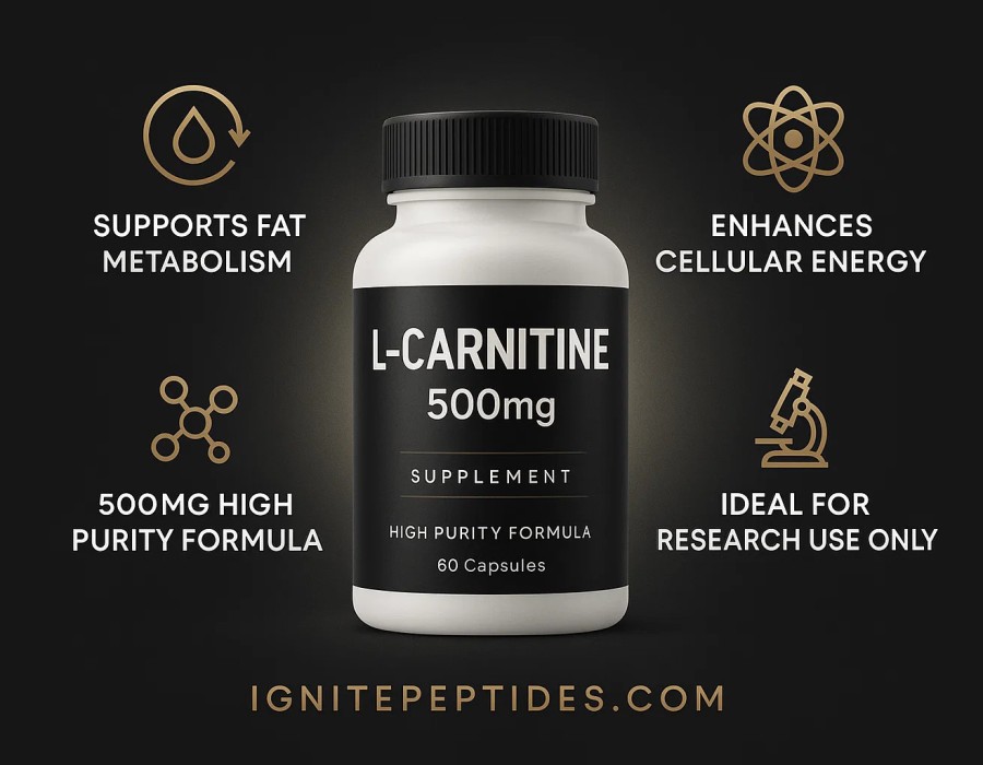 Ignite Peptides’ L-Carnitine 500mg is formulated for high purity and consistency, making it ideal for scientific research and supplement experimentation.