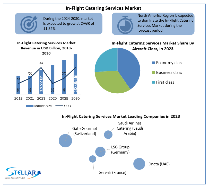 Global In-Flight Catering Services market was valued at US$ 15.22 Billion in 2023, growing from US$ 32.65 Billion in 2030. It is estimated that the Global Market is to grow at a CAGR of 11.52% over the forecast period.