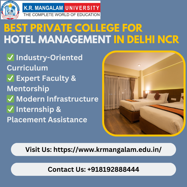 K.R. Mangalam University is recognised as one of the best private colleges for hotel management in Delhi NCR, offering an industry-driven curriculum that prepares students for successful careers in the hospitality and tourism sector. With state-of-the-art infrastructure, expert faculty, and top placement opportunities, the university ensures that students receive world-class training in hotel management.