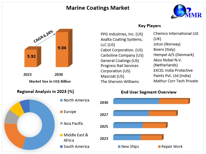 Marine Coatings Market was valued at USD 5.92 Billion in 2023, and it is expected to reach USD 9.04 Billion by 2030, exhibiting a CAGR of 6.24% during the forecast period (2024-2030)