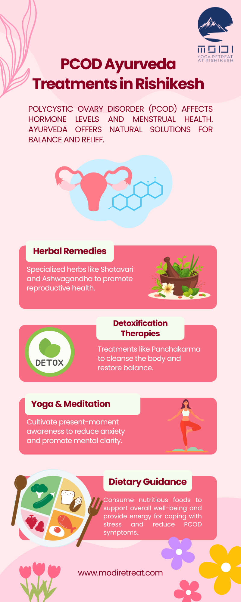 Discover holistic Ayurvedic treatments for PCOD at Modi Yoga Retreat. Nestled in serene Rishikesh, experience personalized therapies, detoxifying herbs, and rejuvenating yoga to balance hormones, enhance fertility, and restore overall well-being naturally.