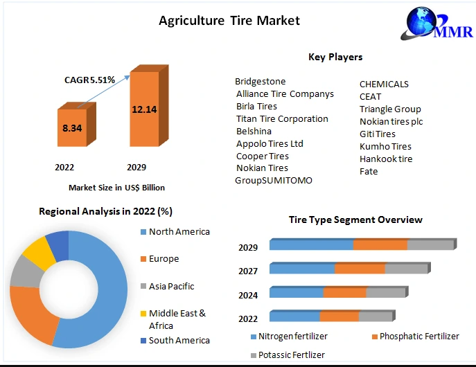 Agriculture Tire Market was valued at US$ 8.34 Bn. in 2022 and expected to grow at a CAGR of 5.51% during the forecast period 2023-2029, thanks to the growing trend of agricultural vehicle use, which has boosted demand for agriculture tires.