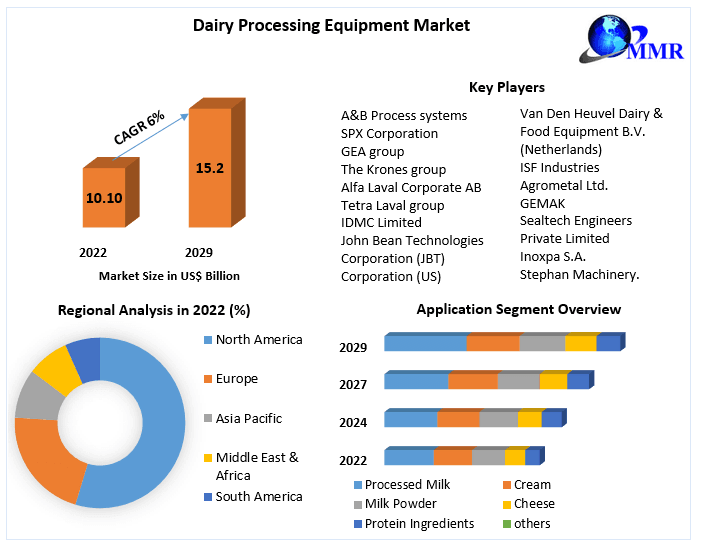 Dairy Processing Equipment Market is expected to reach US$ 15.2 Bn. by 2029, at a CAGR of 6% during the forecast period.