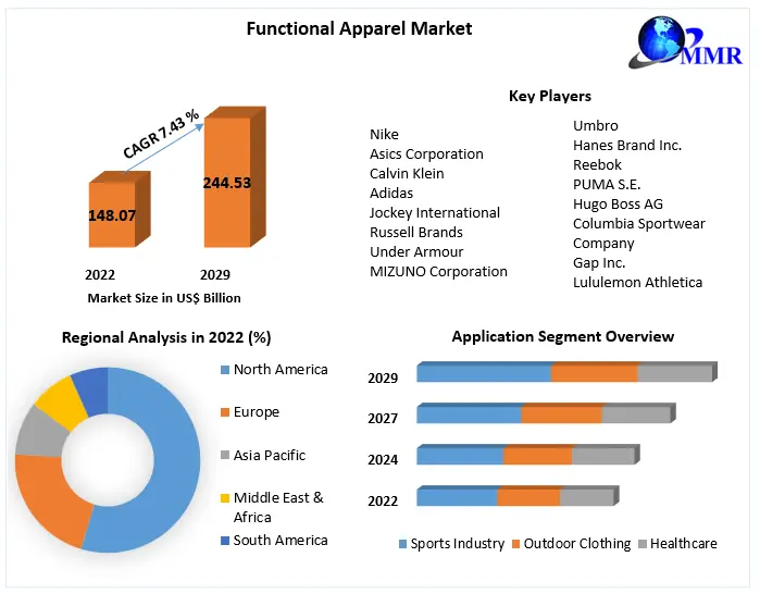 The Functional Apparel Market, encompassing clothing designed for specific activities and purposes, has witnessed substantial growth in recent years. As of 2022, the market was valued at approximately USD 148.07 billion and is projected to reach USD 244.53 billion by 2029, growing at a compound annual growth rate (CAGR) of 7.43% during the forecast period.