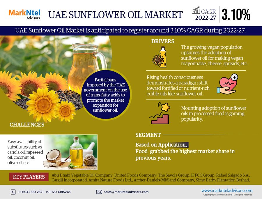 “Markntel Advisors – Leading Market Research Company” has recently conducted a comprehensive examination of the UAE Sunflower Oil Market, encompassing the forecast period from 2022-27. Utilizing data from the historical period of 2017-20, with 2021 serving as the base year, our proficient team of analysts has devoted considerable time to gather and scrutinize the latest market information. The result is a thorough and current report that proves valuable for individuals making data-driven decisions, including business owners and analysts. Whether your objective is to explore new markets, introduce a new product, or maintain a competitive edge, our research report on the UAE Sunflower Oil Market offers well-researched facts and figures relevant to the industry.