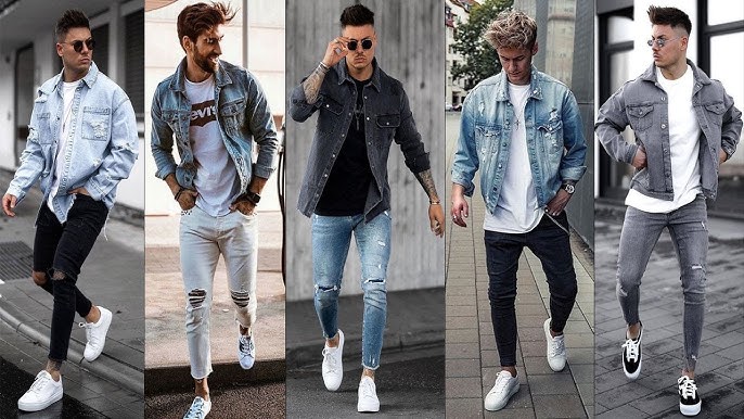 Men's White Cotton Short Jeans with Light Blue Sneakers and Denim Casual Jacket - Perfect Casual Outfit!