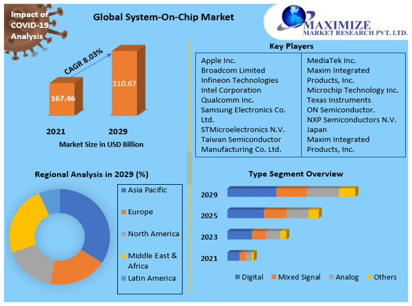 System-on-chip Market was valued at USD 167.46 Billion in 2021, and it is expected to reach USD 310.67 Billion by 2029, exhibiting a CAGR of 8.03% during the forecast period (2022-2029)