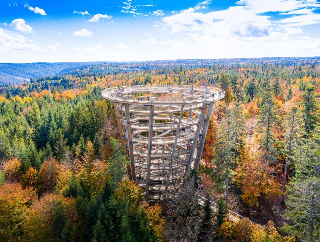 Der Baumwipfelpfad Bad Wildbad erstreckt sich über eine beeindruckende Länge von 1250 Metern und führt Sie hoch über die Baumkronen des Schwarzwalds. Hier können Sie die Schönheit der Natur aus einer Höhe von bis zu 20 Metern genießen. Der Pfad ist barrierefrei und somit für alle Altersgruppen geeignet. Während Sie über die schwingenden Brücken und den spiralförmigen Aussichtsturm schlendern, werden Sie mit einem atemberaubenden Blick auf die umliegende Landschaft belohnt.