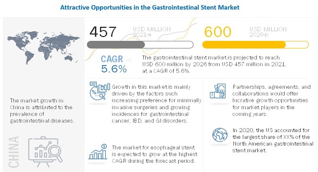 The global Gastrointestinal Stent Market in terms of revenue was estimated to be worth $457 million in 2021 and is poised to reach $600 million by 2026, growing at a CAGR of 5.6% from 2021 to 2026. Gastrointestinal (GI) stents are designed for palliative therapy for various diseases causing obstruction in the GI tract. GI stents have a major role in the recanalization of gastrointestinal (GI) tumours and postoperative leak sealing. Other potential applications of GI stents are drug-eluting devices, tissue modelling for benign conditions, and GI tract drainage or anastomosis. Growth of this market can be attributed to the rising prevalence of GI cancers and other digestive diseases, changing lifestyles, increasing healthcare expenditure on gastrointestinal procedures, and an increasing preference for minimally invasive surgeries.