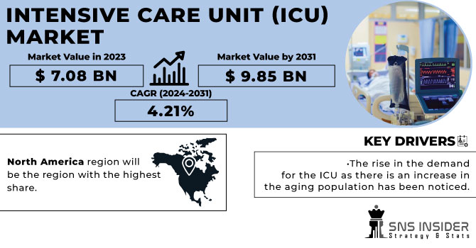 The Intensive Care Unit (ICU) Market size was valued at $ 7.08 Bn in 2023 and is expected to reach $ 9.85 Bn by 2031, and grow at CAGR of 4.21% over the forecast period of 2024-2031.The Intensive Care Unit (ICU) market is experiencing rapid growth, driven by the rising prevalence of chronic diseases, advancements in medical technology, and an aging global population. Innovations in patient monitoring systems, ventilators, and infusion pumps are enhancing ICU capabilities, making them more efficient and effective. The demand for specialized care and personalized treatment plans is also propelling the market, as hospitals and healthcare providers invest in state-of-the-art ICU infrastructure to improve patient outcomes. Furthermore, the COVID-19 pandemic has underscored the critical importance of well-equipped ICUs, leading to increased government funding and private investments aimed at expanding and upgrading these vital units. As a result, the ICU market is poised for significant expansion, with a focus on improving healthcare accessibility and quality worldwide.