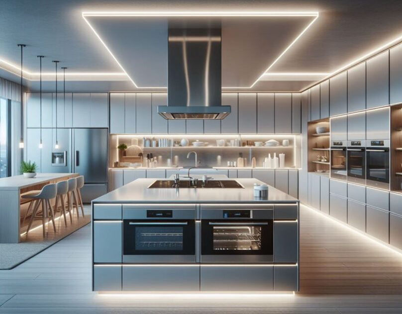 Hide COB strip lights in corner channels under upper cabinets to brighten countertops without glare. It’s perfect for food prep and adds a stylish touch.
