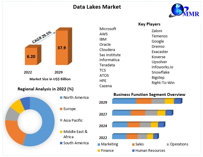 Data Lakes market size is expected to grow at 29.5% throughout the forecast period, reaching nearly US$ 37.90 Billion by 2029.