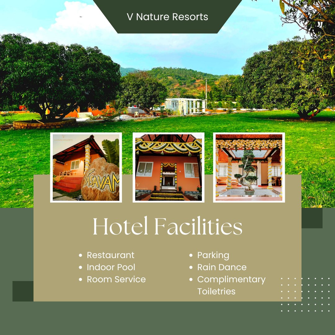 V Nature Resorts in Kanakapura Comfortable and private houses and rooms Sprawling six-acre property with ample greenery Shimmering swimming pool and blaze zone Opportunities for investigation within the encompassing regions Exercises and civilities for all ages Tasty North and South Indian cooking Perfect setting for events and get-togethers Prepared to elude the city chaos and reconnect with nature.
