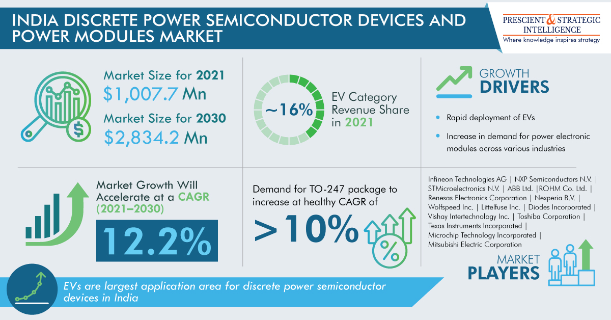 The Indian discrete power semiconductor devices market is on the track to hitting $2,834.2 million by 2030. The fast adoption of EVs and the increase in the need for power electronic modules all over a variety of industries, including aerospace, medicine, and military, are the main drivers of the industry's expansion.