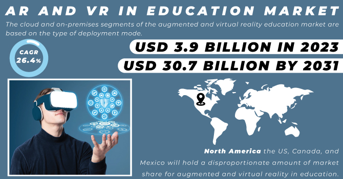 The AR and VR in Education Market size was valued at $ 3.9 bn in 2023 and is expected to grow to $ 30.7 bn by 2031 and grow at a CAGR of 26.4 % by 2024-2031.