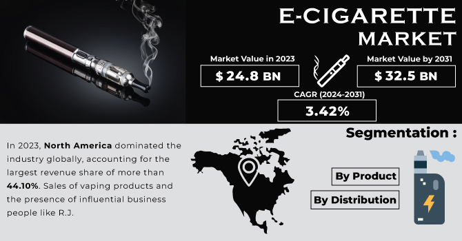 The E-Cigarette Market size was valued at $ 24.8 Bn in 2023 and is expected to grow to $ 32.5 Bn by 2031 and grow at a CAGR of 3.42 % by 2024-2031.