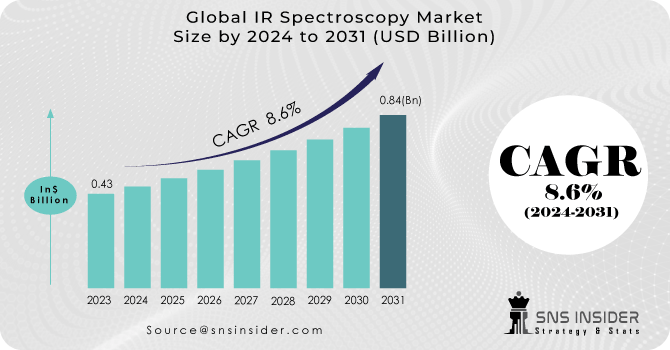 The IR Spectroscopy Market Size was valued at $ 0.43 Bn in 2023 and is expected to reach $ 0.84 Bn by 2031 and grow at a CAGR of 8.6% by 2024-2031.