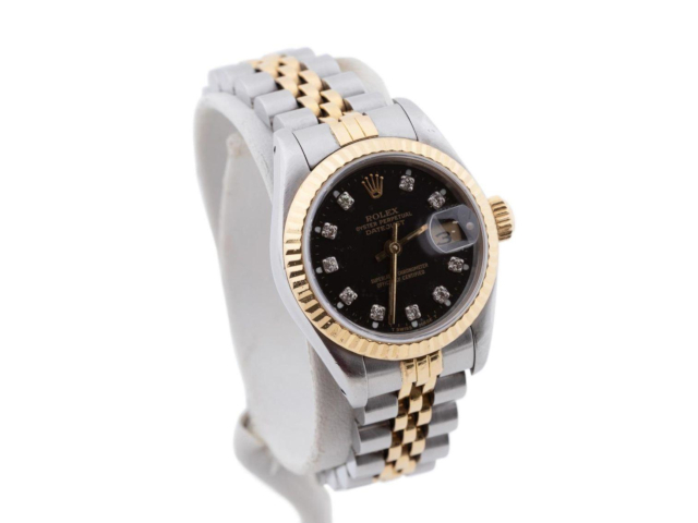 A ladies’ Rolex Oyster Perpetual Date stainless steel, 18k yellow gold and diamond bezel wrist watch with a perpetual jeweled movement, black dial and 10 round brilliant diamond markers weighing 0.20 total carats (graded SI for clarity), with newer boxes and tags, realized $4,235.
